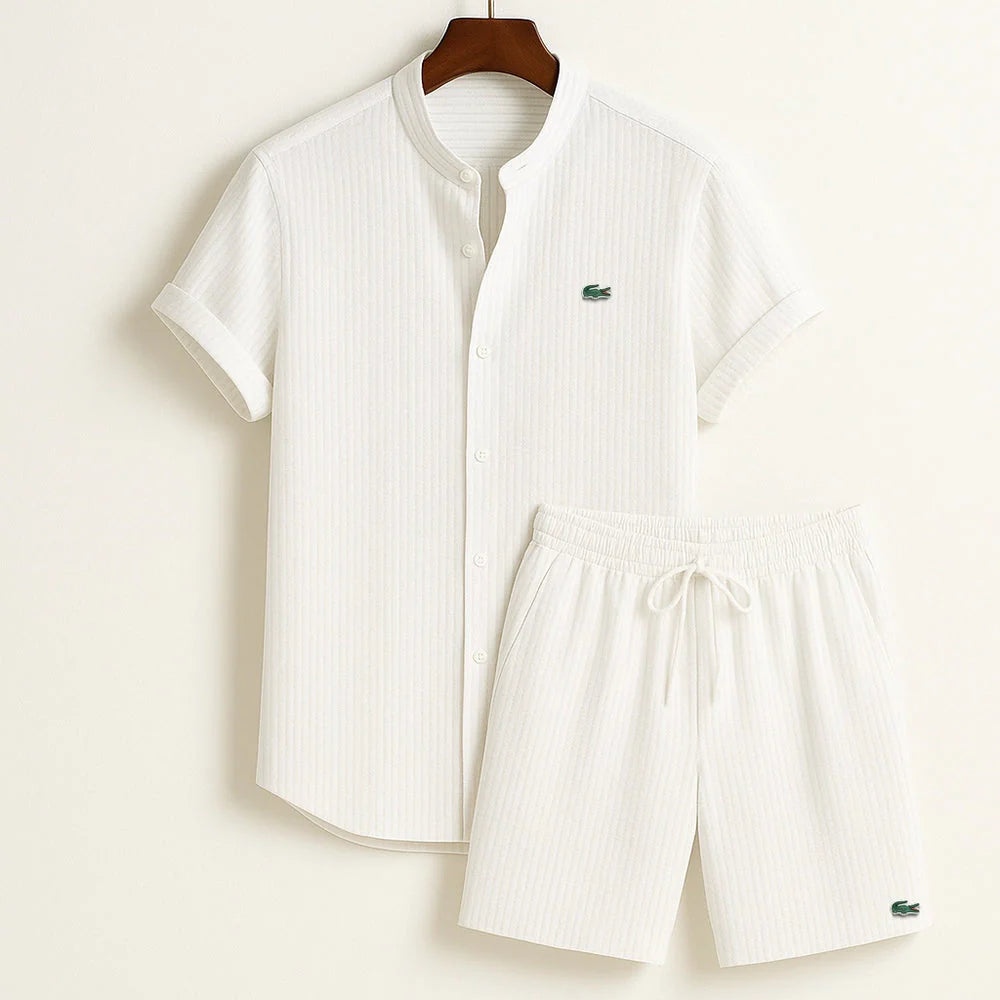 UpptĂ€ck en matchande kostym som förenar stil och lĂ€tthet. Skjortan, med korta uppvikta Ă€rmar och knappstĂ€ngning, ger ett frĂ€scht utseende i alla situationer – frĂ„n soliga eftermiddagar till avslappnade kvĂ€llar. Den lĂ€tt ribbade strukturen ger en subtil touch och samtidigt en behaglig kĂ€nsla mot huden.